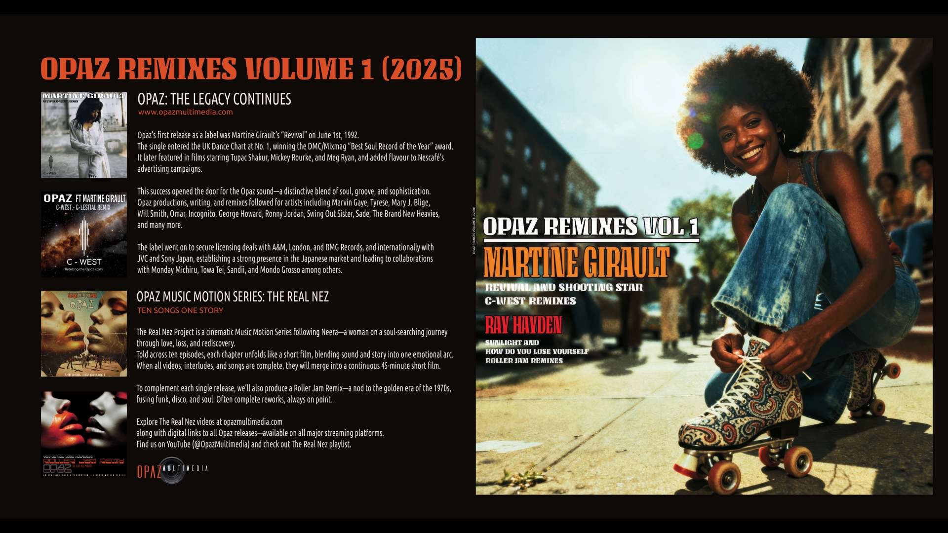 This success opened the door for the Opaz sound—a distinctive blend of soul, groove, and sophistication. Opaz productions, writing, and remixes followed for artists including Marvin Gaye, Tyrese, Mary J. Blige, Will Smith, Omar, Incognito, George Howard, Ronny Jordan, Swing Out Sister, Sade, The Brand New Heavies, and many more.